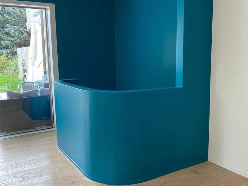 Mur arrondi peint en bleu canard avec finition soignée et parquet en bois clair – Travaux de peinture et décoration intérieure par AK Rénovation dans le Pays de Gex